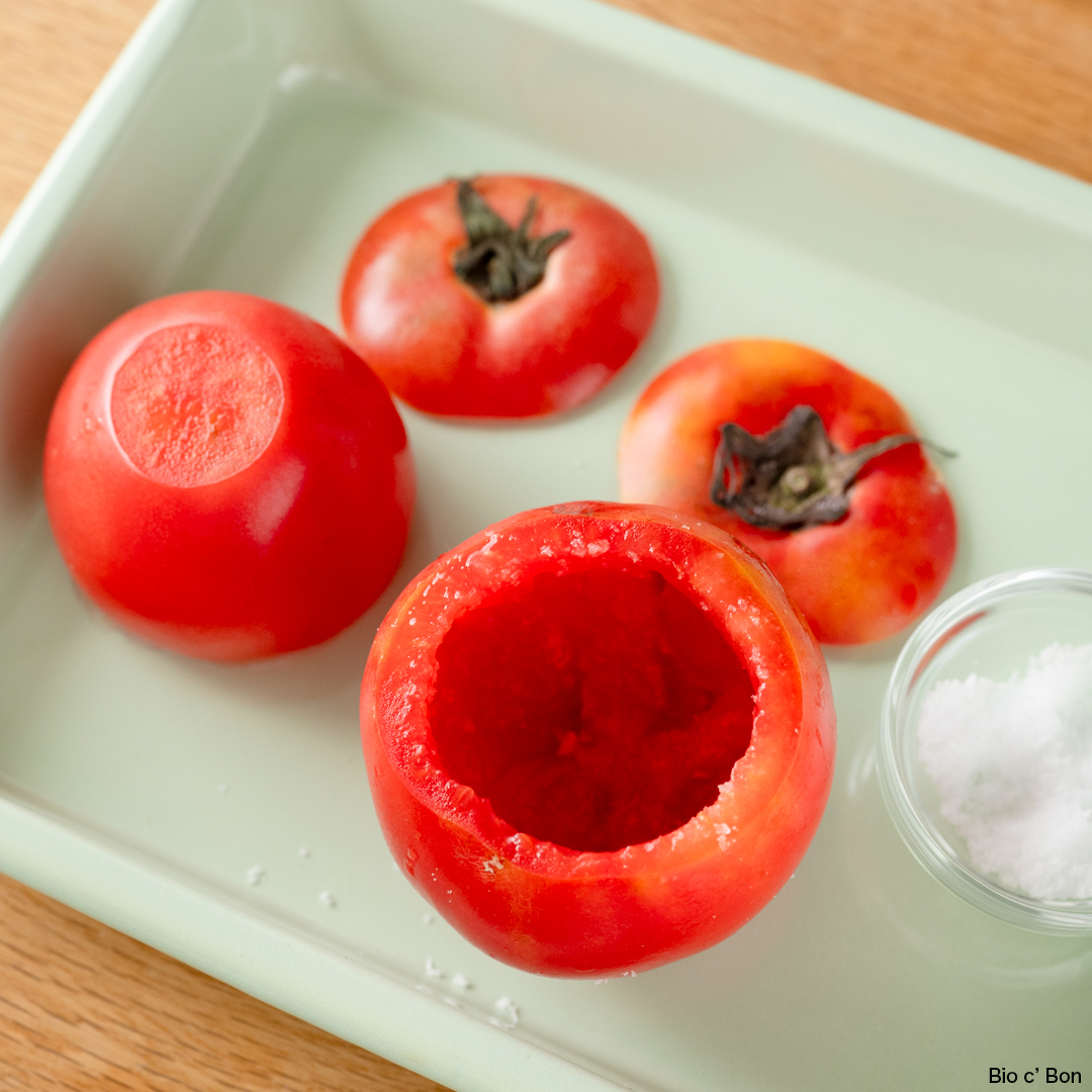 - トマトは上から1cmほどのところで横に切り、底も薄く切って安定させる。スプーンで中身をくり抜く。トマトの内側に塩(分量外)をふり逆さに置いて余分な水分を抜いておく。