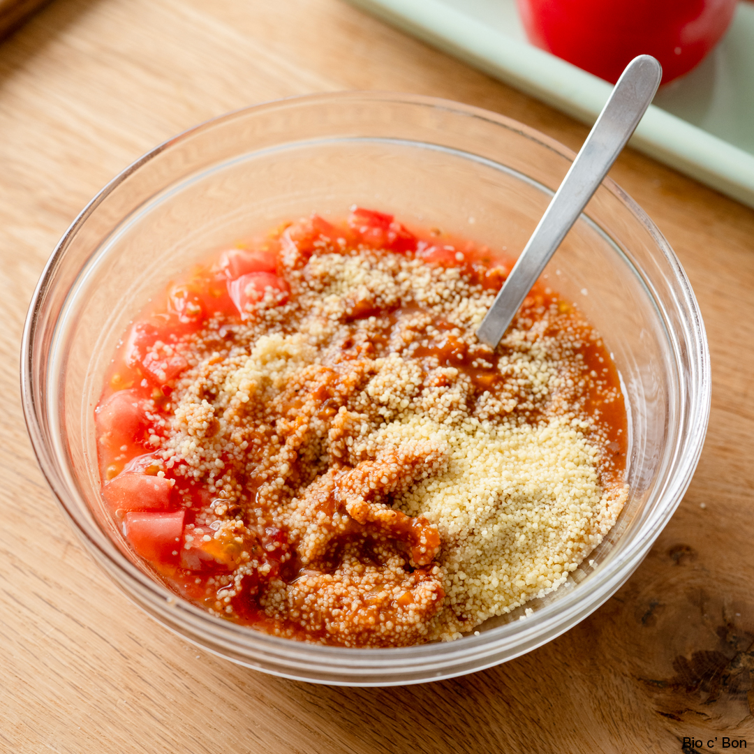 - クスクス、ミートソース、オリーブオイルをボウルに入れる。トマトの果肉を1cmほどの角切りにし加える。※水っぽくならないよう、ミートソースとトマトの水分量を見ながら調整を!