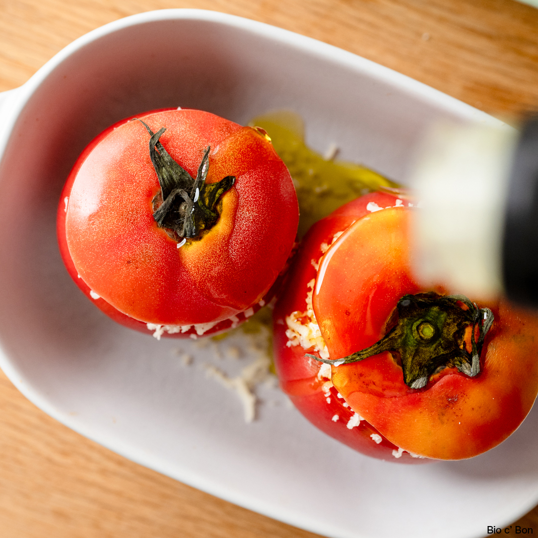 - 耐熱容器に入れたら、トマト全体にオリーブオイル(分量外)を回しかける。トースターで15分〜20分焼いたら完成!