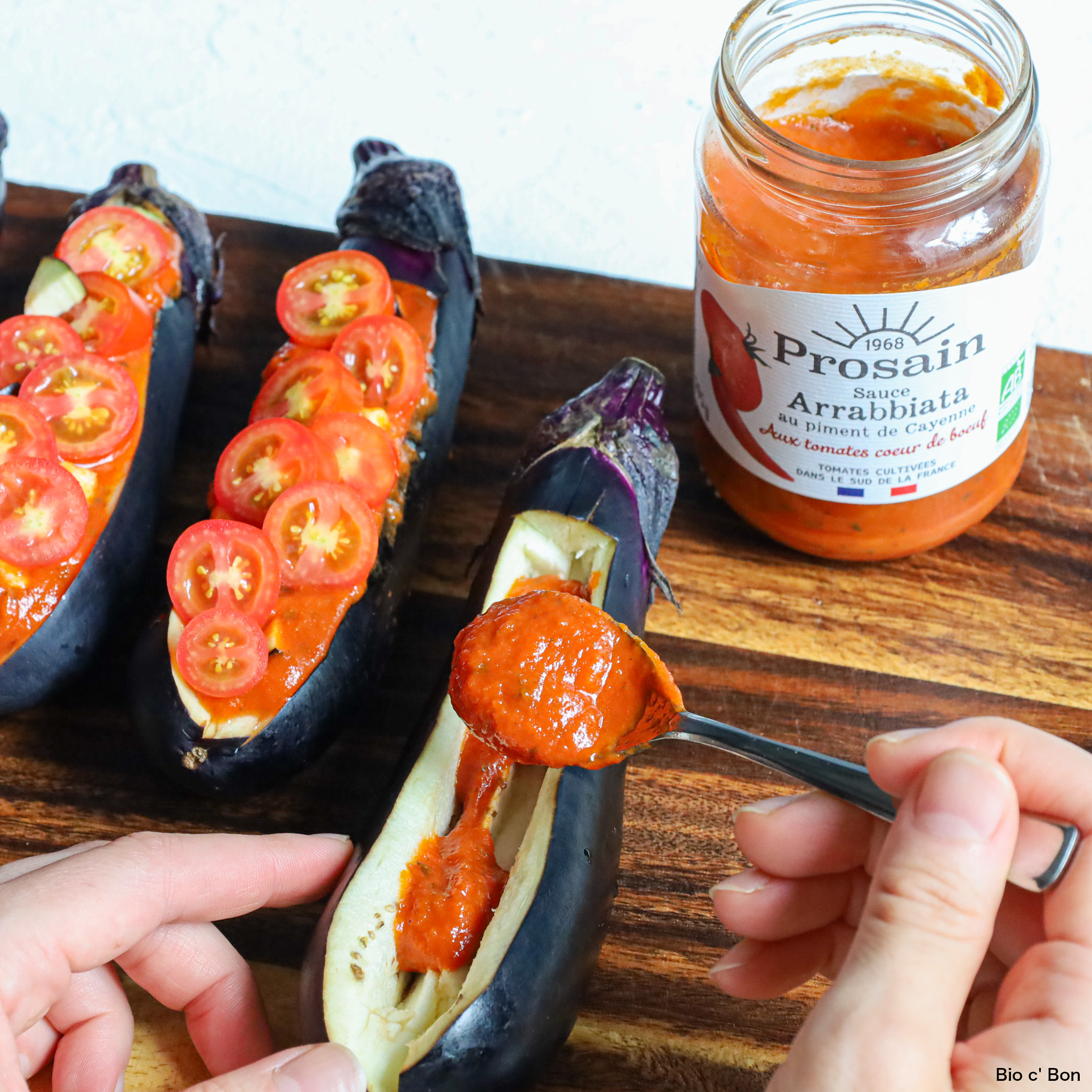 - ナスの切り口に塩をふり、トマトソースと細かく乱切りにしたナスを詰める。