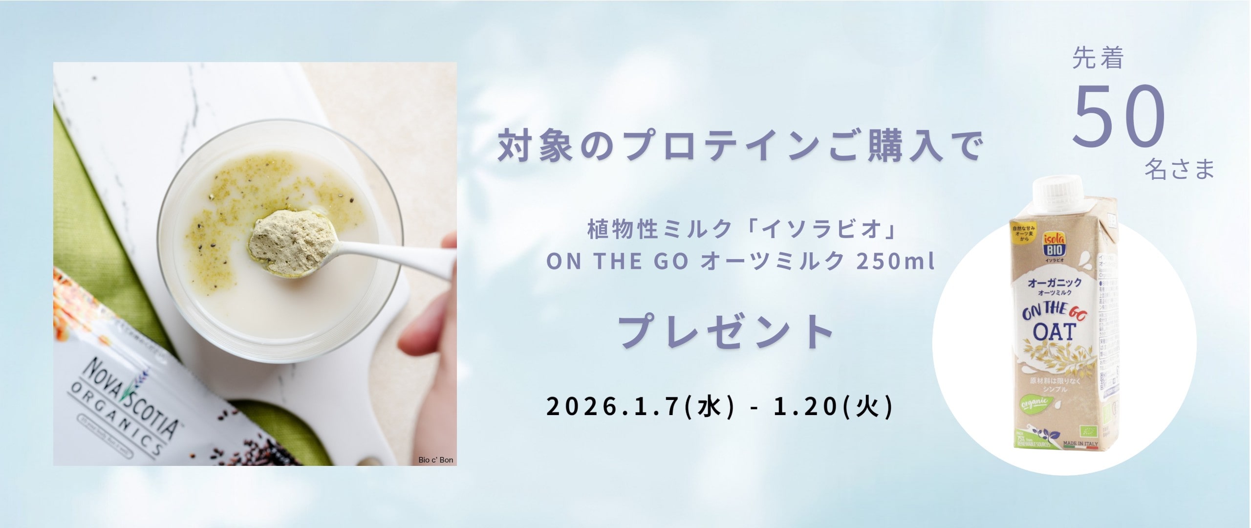 期間中、対象のプロテインをご購入いただいたお客さまに、毎日続けたいプロテイン補給にぴったりなオーガニック植物性ミルク「イソラビオ」をプレゼント!