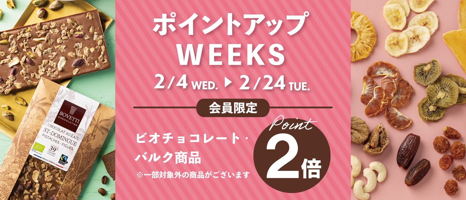 大人気のバルク(量り売り)全品と一部ビオチョコが今だけポイント2倍♪バルク(量り売り)の一部商品は100g単位でご注文も可能です(店舗では20g単位)。ジッパー付き袋入りの大容量タイプもあり、日々のストックにも便利。ぜひこの機会にご利用ください。