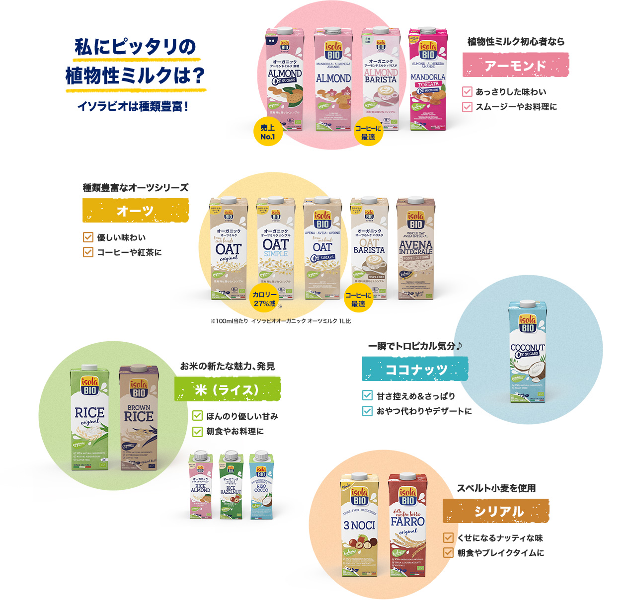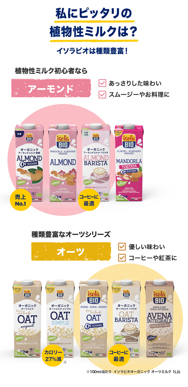 A. 種類が豊富なオーツミルクはほんのり自然な甘さでそのまま飲んだり、カフェラテやお料理など幅広くお使いいただけます。また、すっきりした味のアーモンドミルク(無糖)はそのまま飲むのはもちろん、シリアルやプロテインと混ぜても美味しくお召し上がりいただけます。いろいろ試して、自分のお気に入りや定番を見つけていくのも楽しいですね!