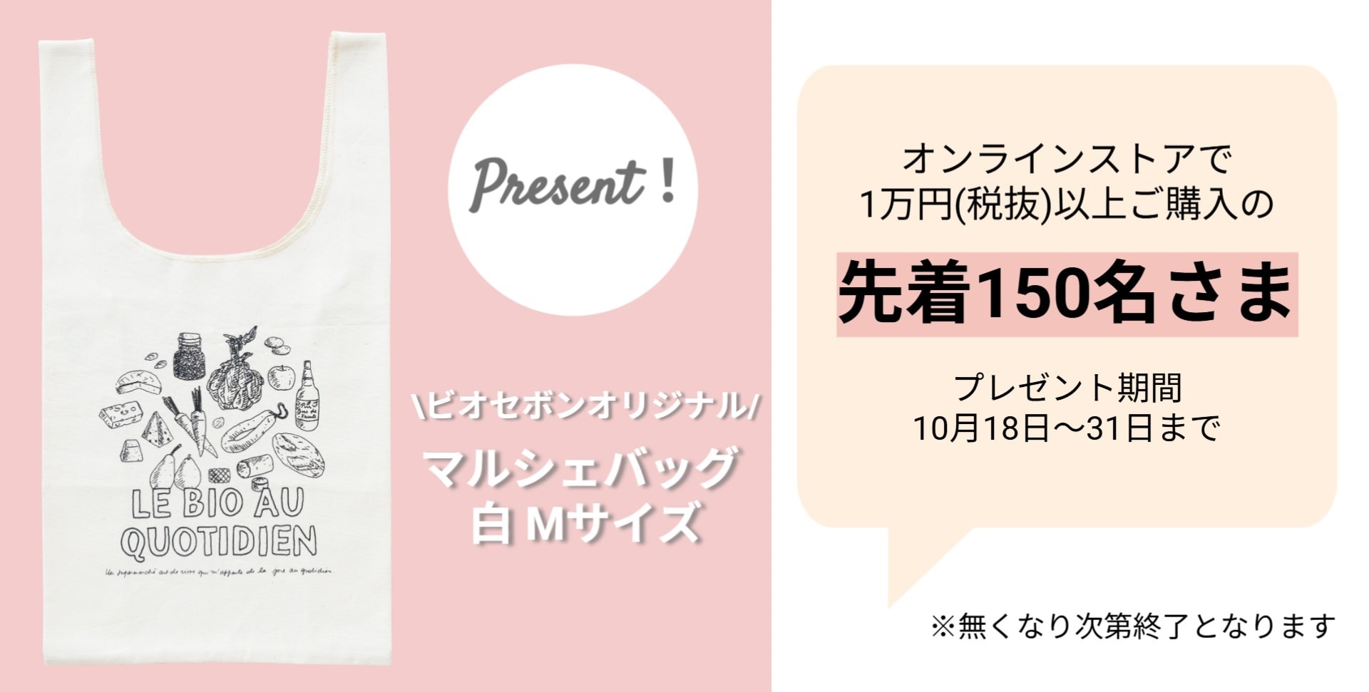 オンラインストアにて1万円(税抜)以上ご購入いただいた先着150名さま限定で、お買い物やサブバッグに便利なオーガニックコットンバッグをプレゼント♪10月末までの期間限定となりますのでお見逃しなく!
