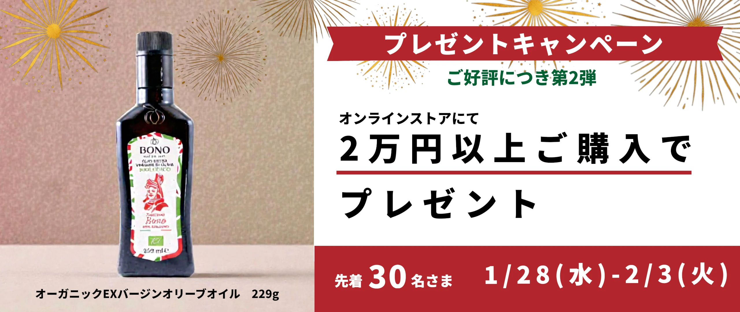 【ご好評につき第2弾!】オンラインストアにて冷凍食品を除く、2万円(税抜)以上ご購入いただいた先着30名さま限定で、2025年に実施した「ビオセボン総選挙」で TOP9に選ばれた定番人気の「ボノ」オーガニックEXバージンオリーブオイル(現品)をプレゼント!是非この機会にお買物をお楽しみください。